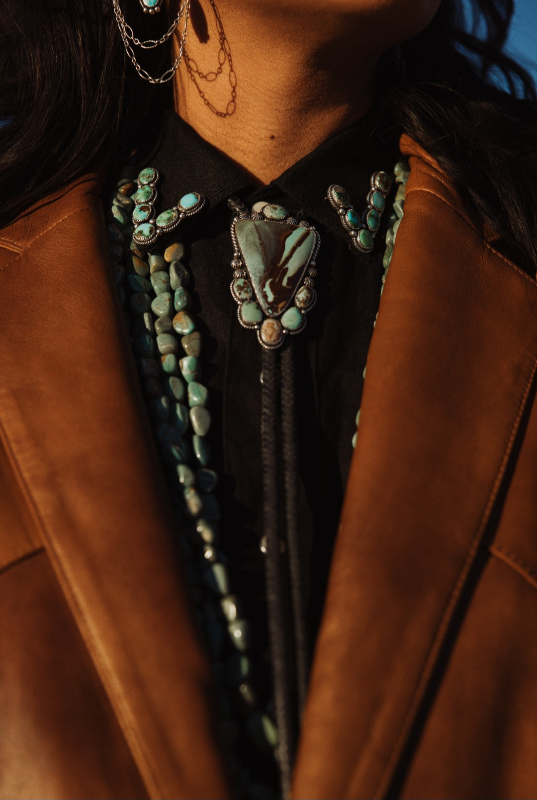 This bolo has been a long time coming. The main stone is one I picked up on a trip to Arizona three years ago—one of those pieces you hang onto because you know it deserves something special. I finally built it into this big, beautiful bolo, framed with smaller complementary stones, silver accents, and a classic rope border that pulls it all together.
