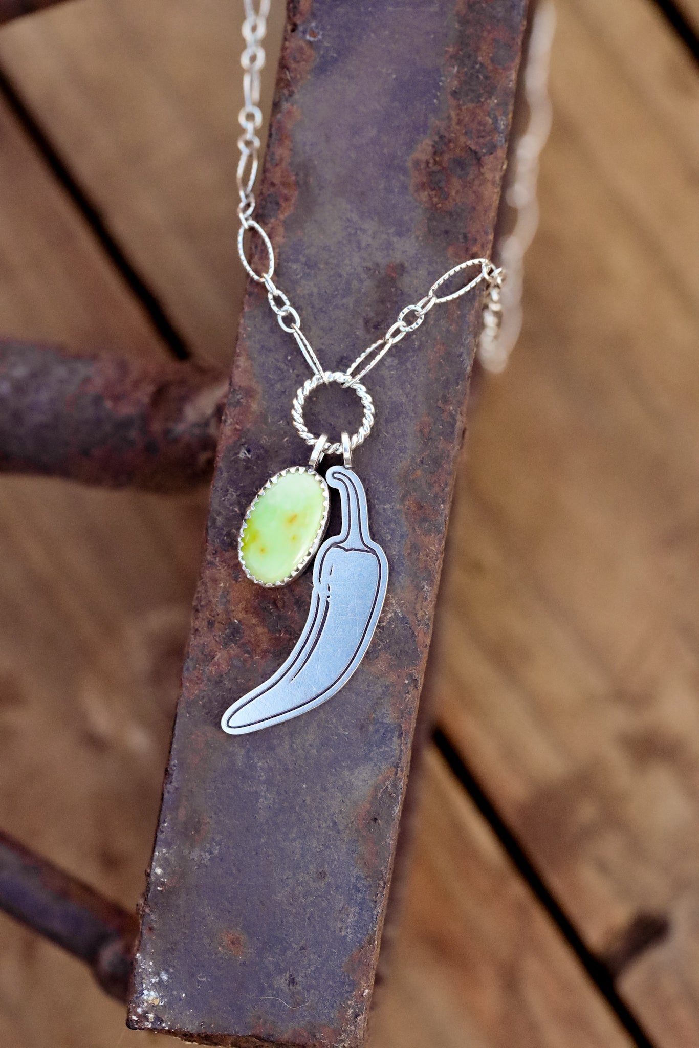 Turn up the heat on your everyday look. This 16" necklace features a gorgeous yellow Palomino turquoise stone paired with a sterling silver chili pepper charm, strung on a patterned sterling chain. Easy to wear daily but bold enough to make a statement—this one’s a little spicy, a little playful, and completely unique.