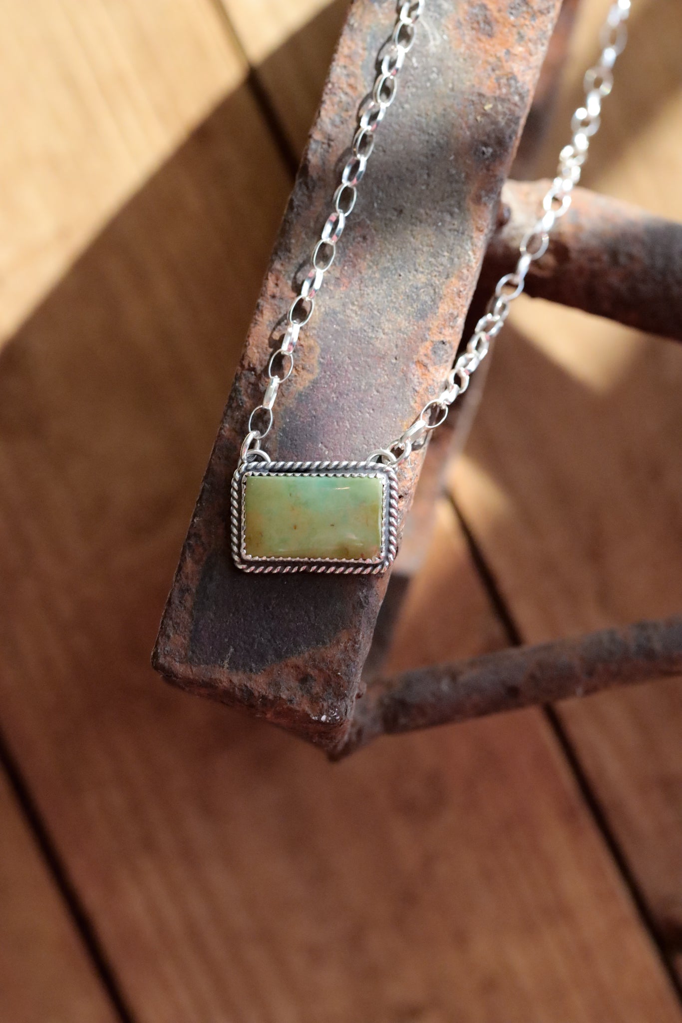 A pretty little bar of Evans mine turquoise set in sterling silver and wrapped in a rope border! The chains measure 18" from end to end, and the bars are about 1" by .5". The links on the chain are large enough that it can be clasped anywhere along the length so you can layer with other necklaces.