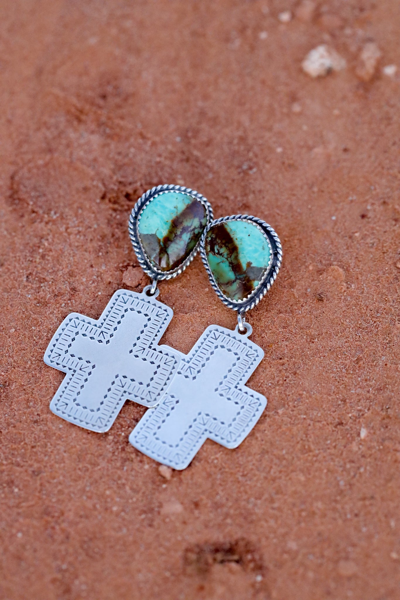 Gorgeous green Kingman turquoise with a split brown matrix set in sterling silver. They measure 2" long by 1" wide.