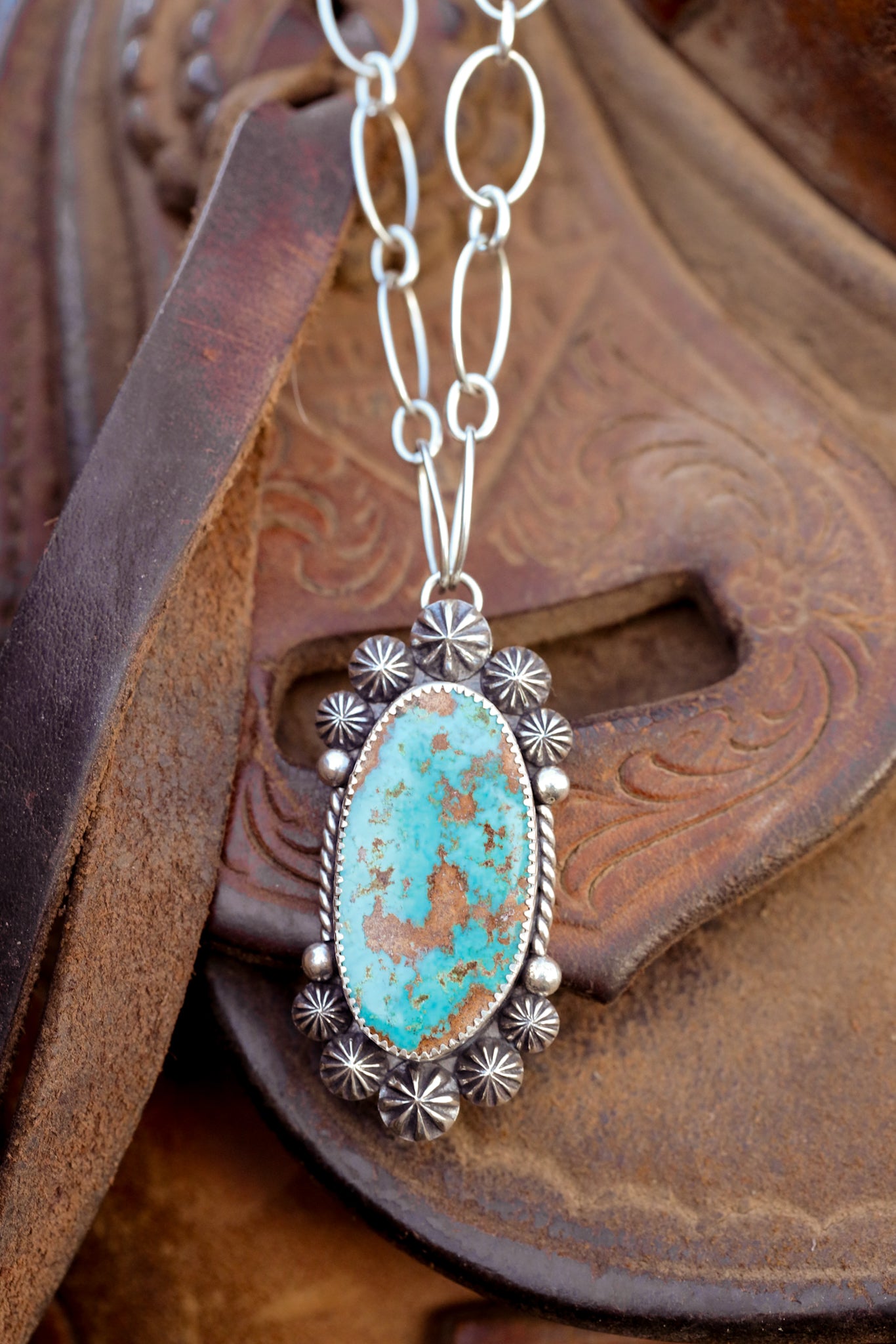 A true showstopper. This 18" necklace features a stunning Nevada mined turquoise stone, with multiple blue hues and a brown matrix. The pendant is framed with varying sizes of sterling silver parachute accents, adding depth and texture, and it hangs from a chunky chain that can be clasped anywhere for versatile layering. Bold, southwestern craftsmanship designed to turn heads.
