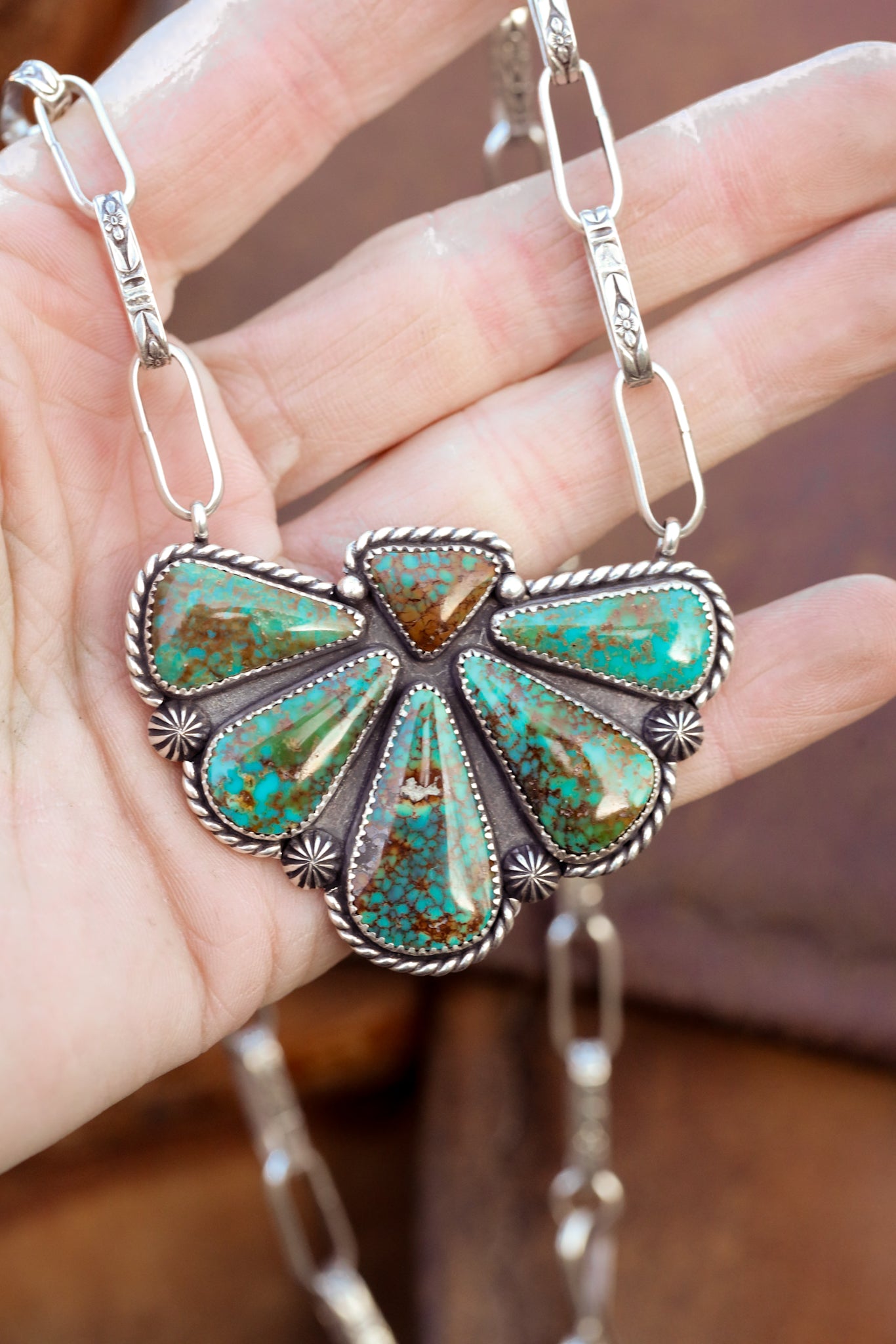 I’ve been looking forward to this one since I bought the stones, what a stunning set! Dark blue turquoise with ribbons of brown running throughout for an amazing contrast. This style necklace is gorgeous all by itself, but is amazing for layering with other pieces as well.