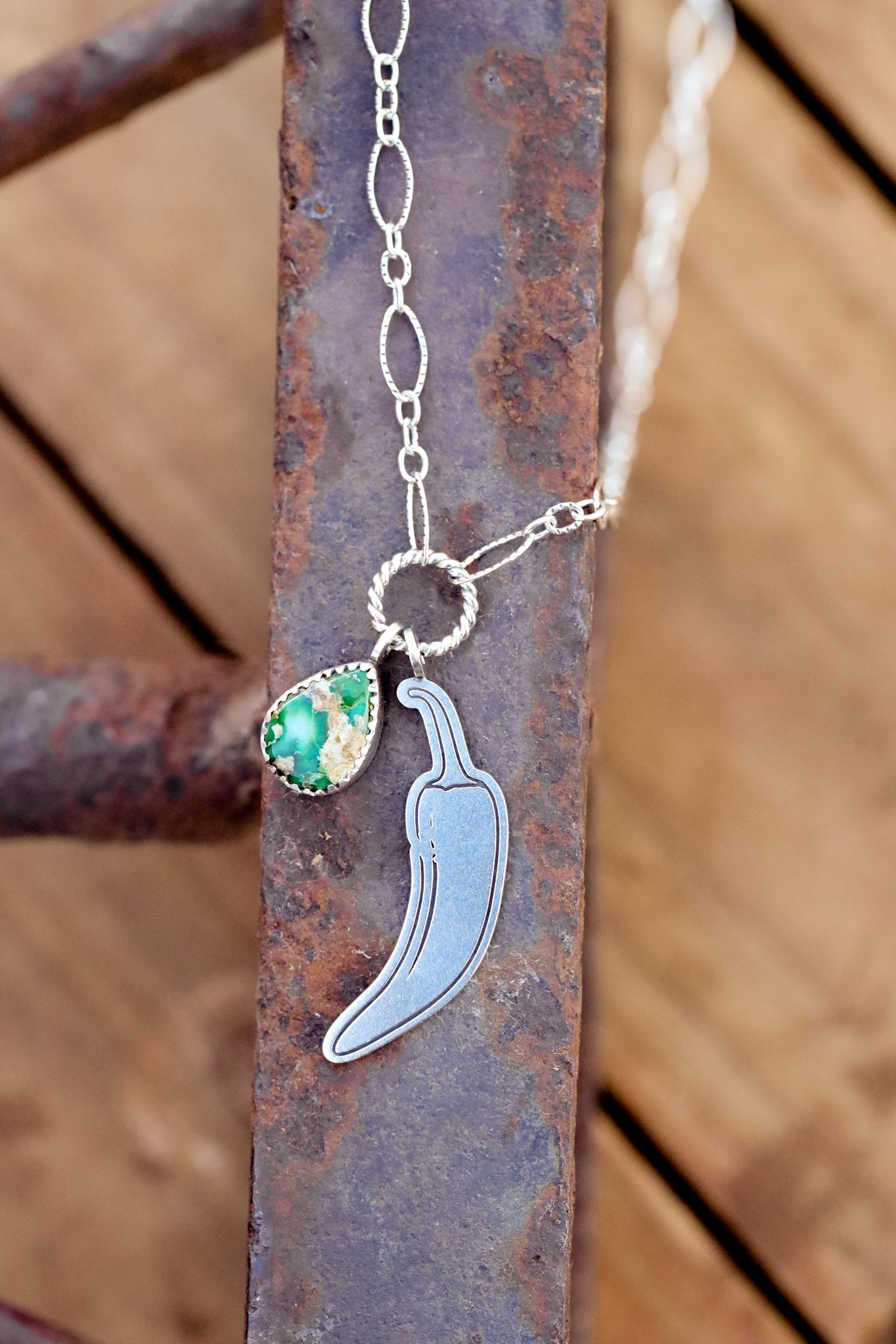 Turn up the heat on your everyday look. This 18" necklace features a gorgeous green Sonoran Gold turquoise stone paired with a sterling silver chili pepper charm, strung on a patterned sterling chain. Easy to wear daily but bold enough to make a statement—this one’s a little spicy, a little playful, and completely unique.