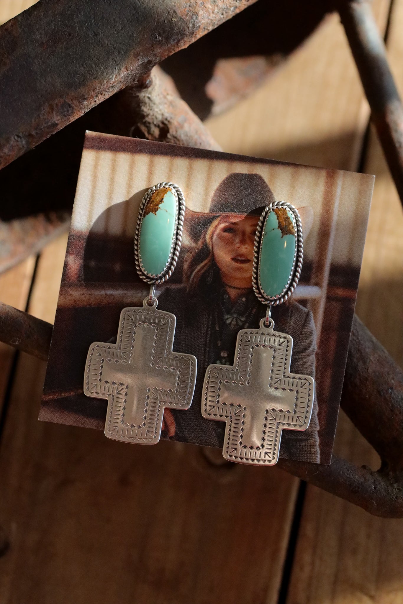 Gorgeous greenish blue Kingman turquoise with brown matrix set in sterling silver. They measure 2" long by 1" wide.