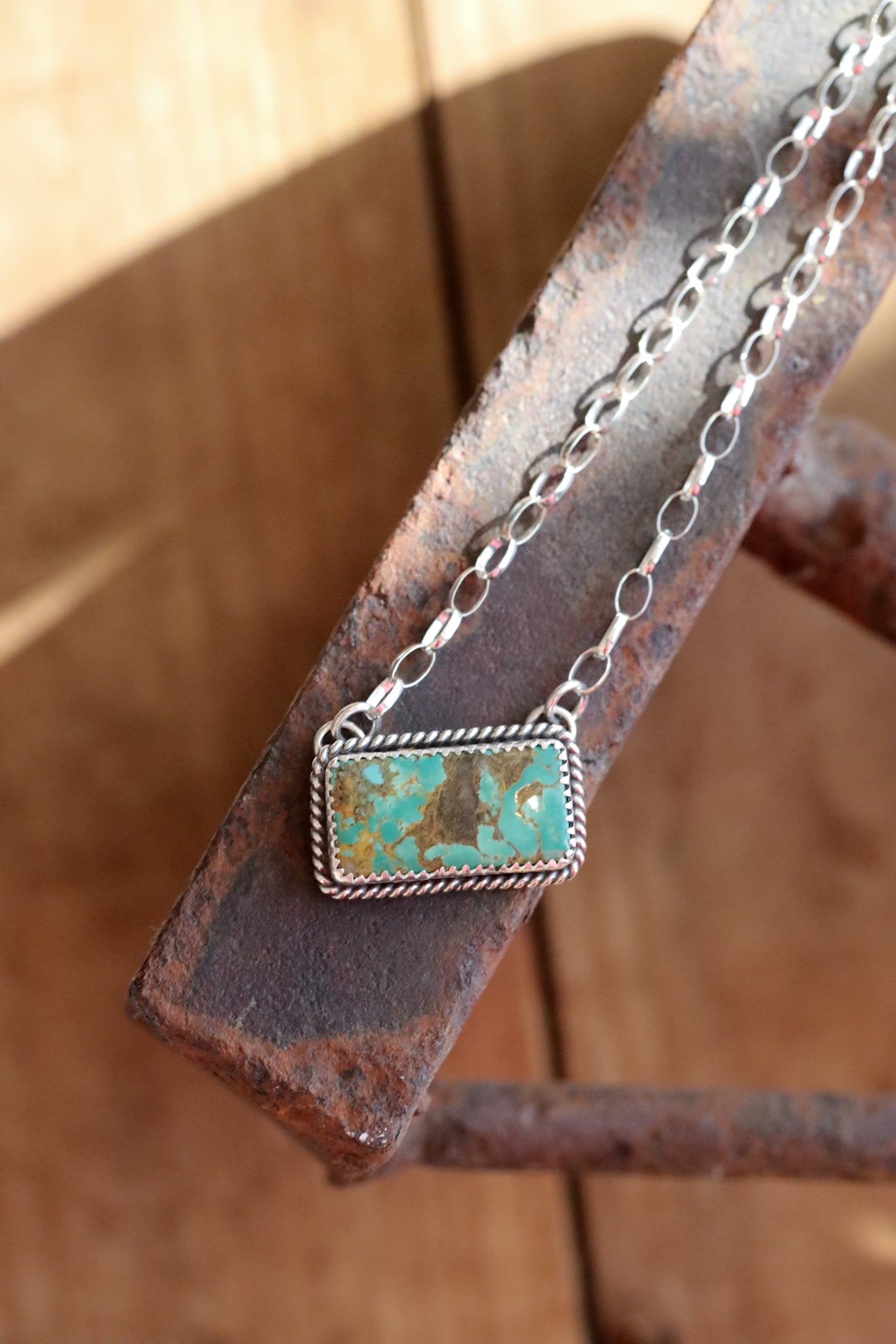A pretty little bar of Tyrone mine turquoise set in sterling silver and wrapped in a rope border! The chains measure 18" from end to end, and the bars are about 1" by .5". The links on the chain are large enough that it can be clasped anywhere along the length so you can layer with other necklaces.