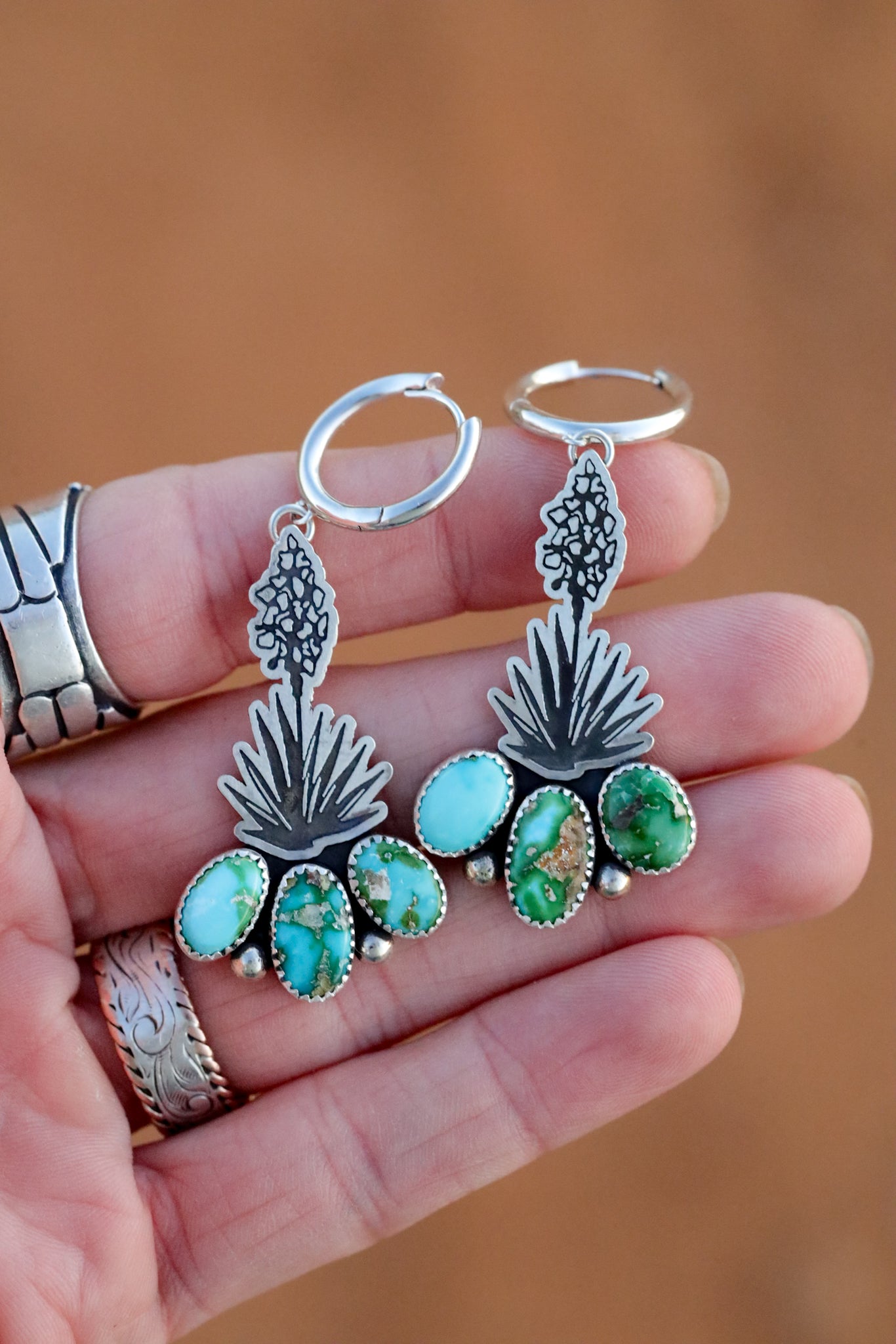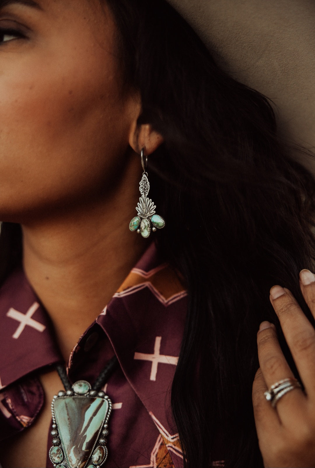 These little yucca earrings are the sweetest nod to the desert—complete with three Sonoran Gold turquoise stones at the base of each plant. They’ve got that perfect pop of green and blue that Sonoran is known for, without feeling too loud. They are nice and light, and measure in at 2" long.